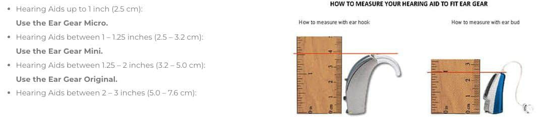 Ear Gear is available in some great colours. Ear Gear Original is designed to fit hearing aids from 1.25 to 2 inches (3.2cm to 5cm), Ear Gear Mini Curved fits hearing aids from 1 to 1.25 inches (2.5cm to 3.2cm), and Ear Gear Micro fits the smallest hearing aids that are 1 inch or less (that’s 2.5cm).
